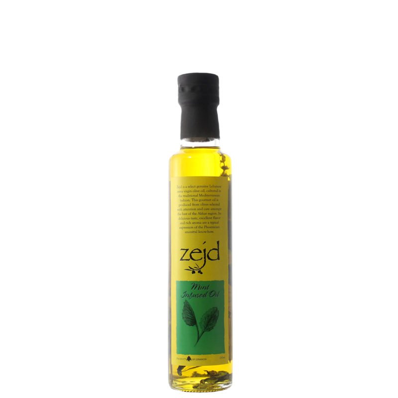 Zejd Mint Infused oil is an aromatic extra-virgin olive oil naturally infused with home-grown, cut at full bloom, and air-dried mint. Produced exclusively from the finest, handpicked, Souri olives, this olive oil is first cold pressed immediately upon harvest and infused to elevate your favorite dishes with its sweet fresh, fruity, aromatic taste.